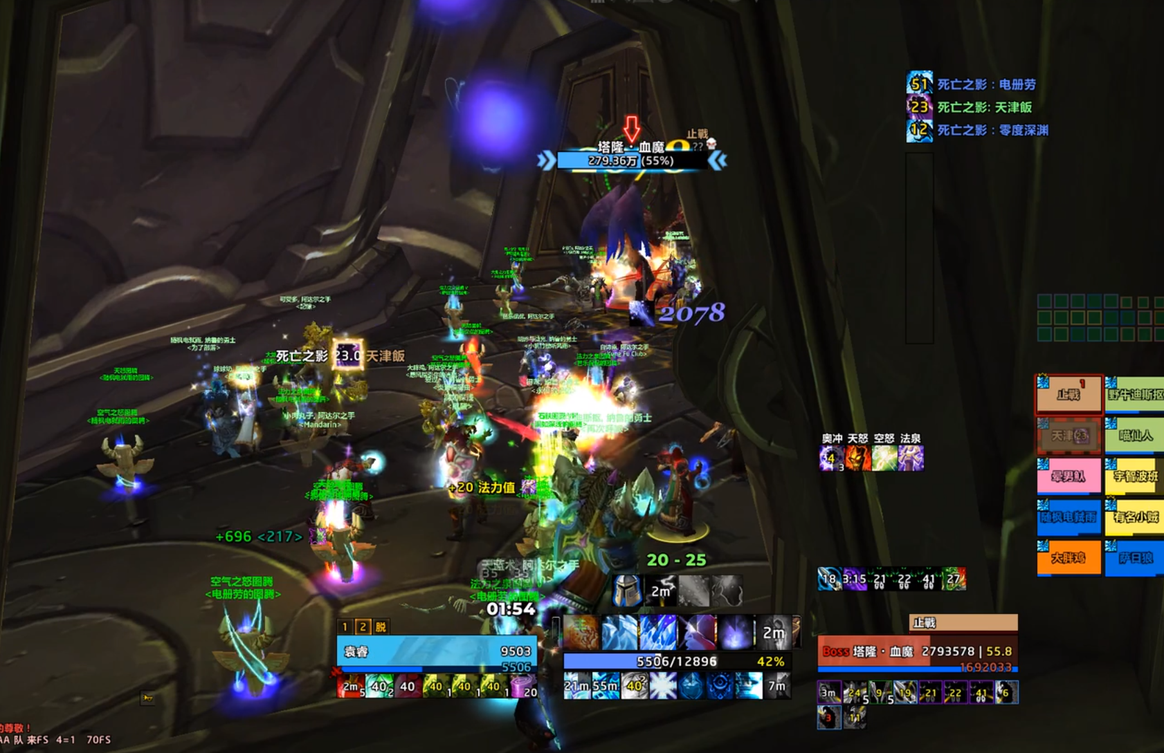 塔隆血魔并没有太过繁琐的机制,塔隆血魔自身伤害较高,在黑暗神殿所有BOSS里能排进前三,因此打塔隆血魔的时候治疗一定要加好MT,防止塔隆血魔直接秒杀MT。另外就是塔隆血魔的招牌技能死亡之影了,这是大部分野团最容易灭团的一个点。死亡之影会随机点名一位玩家,在55秒以后会把玩家转化成复仇之灵,复仇之灵持续60秒的时间,在60秒的时间里要击杀4个小怪,防止小怪扰乱治疗加血。