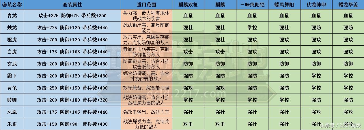 5.套装也存在克制属性,比如防御能力高的霸下就被普通攻击伤害高的白虎克制,具体的可以看上面的表格。