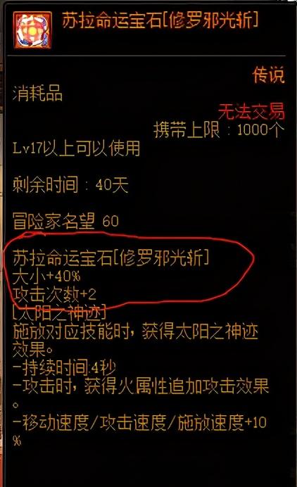 当然也不是所有的传说宝石都会增加技能的输出能力,例如苏拉命运宝石(嗜魂封魔斩)的效果为持续时间+50%,效果十分鸡助,几乎对角色没有任何帮助,还白白占用一个格子,小伙伴们在装备宝石的时候一定要注意。
