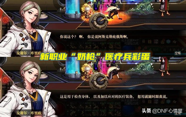 一个游戏要想持续发展,推出新职业是必然趋势!继女鬼剑士第五转职刃影,男枪第五转职合金战士后,又有新职业的身影出现。如图所示“麦谢尔·库里欧”对话,明确告诉玩家,“这是用于检查身体,以及加以应对的医疗设备”,从而奠定了医疗兵职业特征。