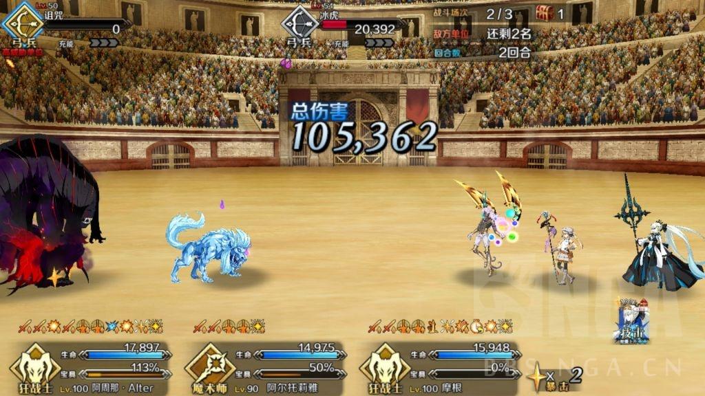 T2 开狂娜2技能 视情况打摩根或者狂娜宝具 打摩根宝具的情况需要指令卡补刀 需要注意即使5宝摩根也不一定能够击杀6.8W的冰虎。