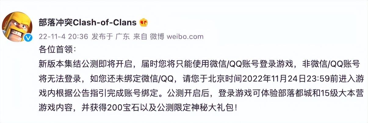 小伙伴们都听说了吗?由于昆仑游戏与Supercell合约到期,部落冲突将由腾讯游戏负责接手,为了保证游戏正常体验,已经用微信/QQ登录游戏的玩家不需要重复绑定,而不是微信/QQ登录的玩家需要尽快绑定账号,如果没在11月24日23:59前完成绑定,可能会影响后续的体验哦